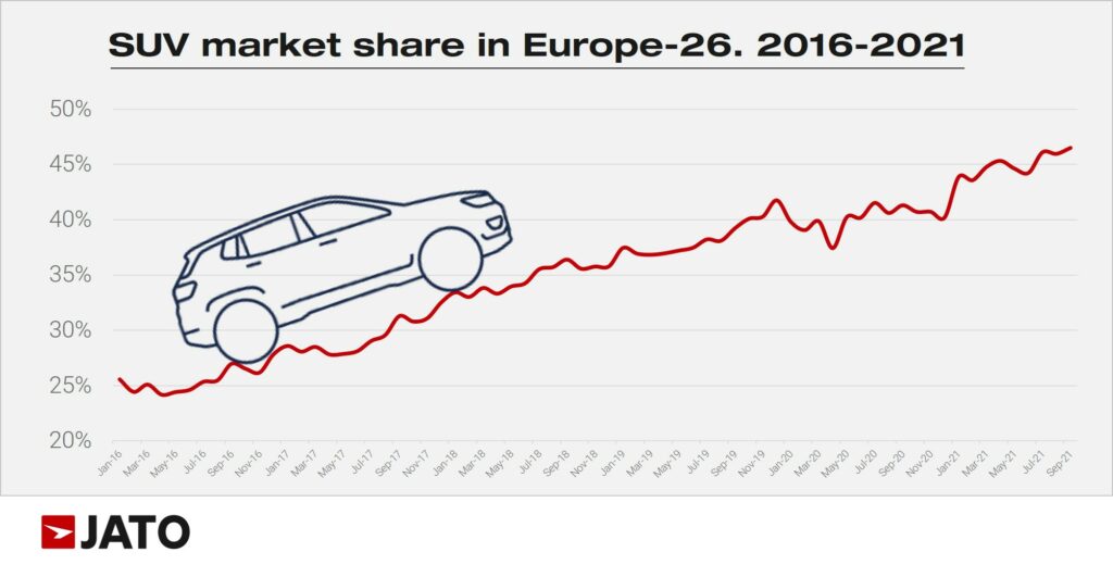 According to JATO’s data for Europe, the seven European car brands that focused their efforts on developing SUVs, have seen their overall sales in the B and C segments fall dramatically between 2001 and 2021.