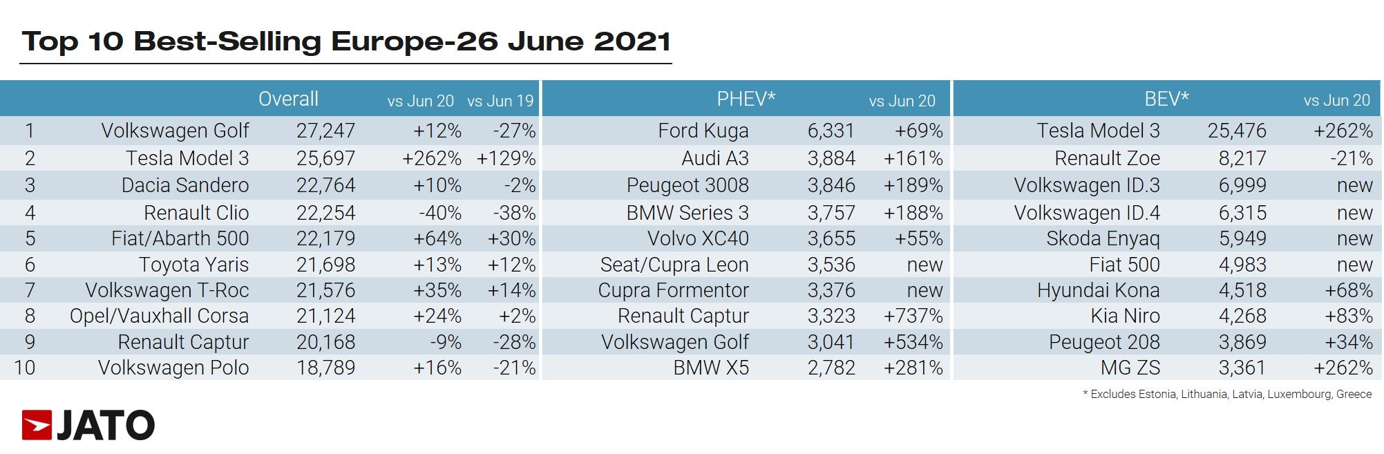 In the model rankings, the Volkswagen Golf was the most popular new car amongst consumers with 27,247 units, equating to a 2.15% market share. Despite the increase of 12% from June 2020, volume fell by 27% when compared with June 2019 – when its market share was at 2.52%. The Golf was followed by the Tesla Model 3, which registered 25,697 units taking the year-to-date total to 66,350 units, making it the most popular electric vehicle in Europe, and the 25th best-selling model in the general rankings through to June. The Model 3 was the top-seller in Austria, Norway, Switzerland and the UK, and hit the top 10 in Denmark, France, Germany, Ireland, Luxembourg and Sweden.