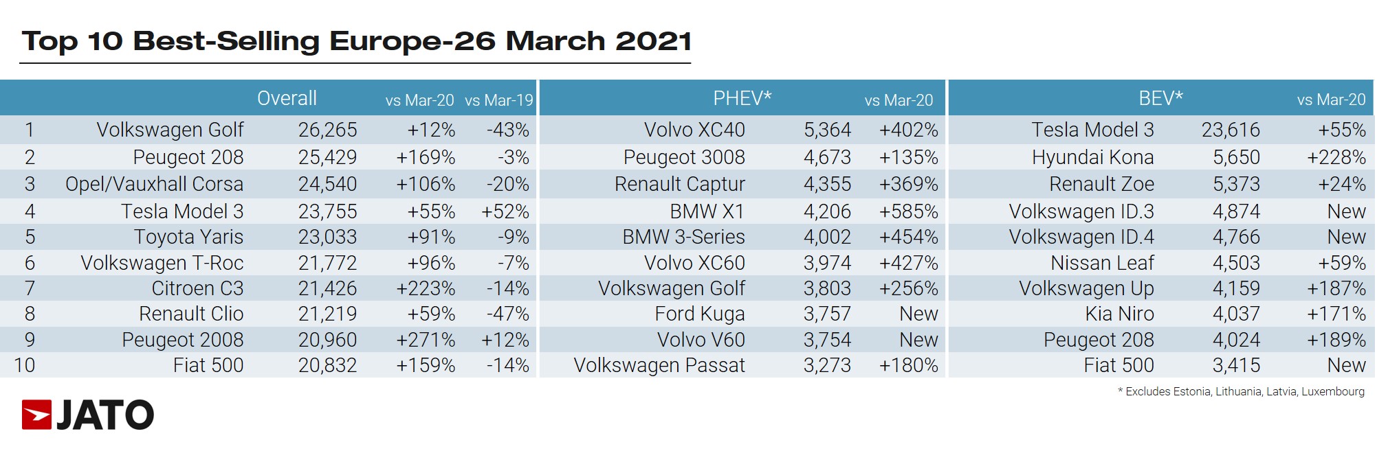 In the European model rankings, the Volkswagen Golf reclaimed its position as the most registered car in Europe with 26,265 units, up by 12% in March 2021. The electrified versions (PHEV and MHEV) of the Volkswagen Golf contributed to this growth, especially in Germany, where they accounted for 36% of the model’s volume. The Golf outsold the Peugeot 208 by 836 units, which was the top-seller in Q1, with almost 61,000 units in total. The Opel/Vauxhall Corsa also performed well, comfortably outselling the Renault Clio and Volkswagen Polo.