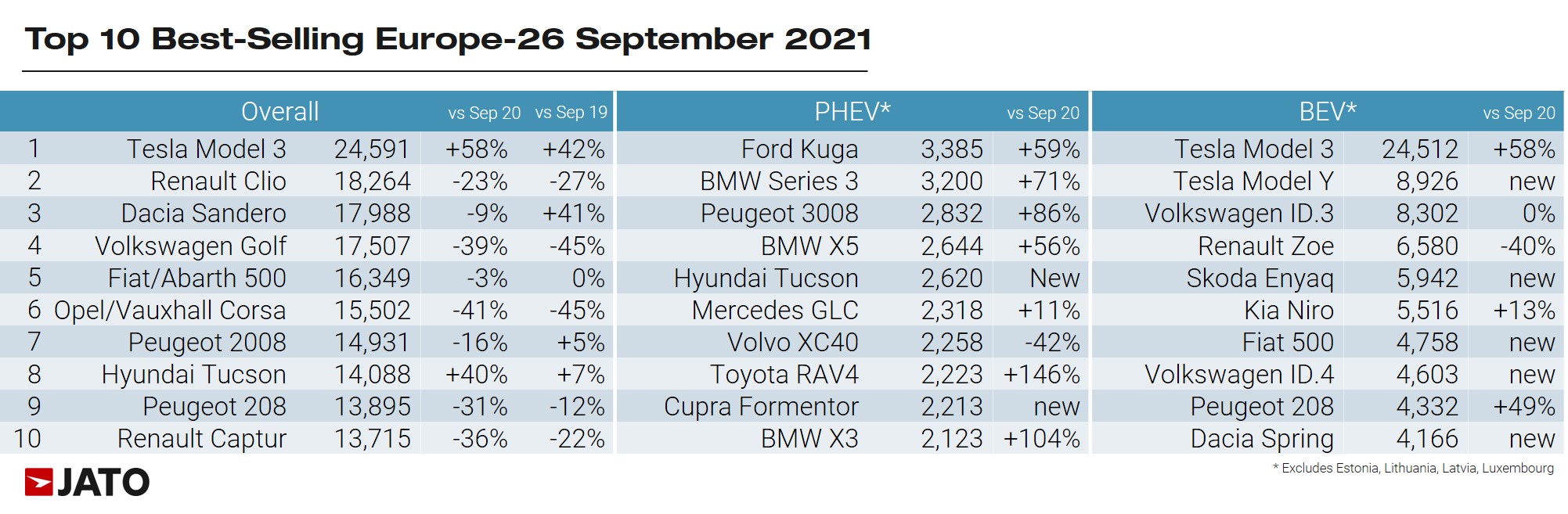 As a result of the EV boom, the Tesla Model 3 topped the European model rankings in September, with 24,600 registered units – a 2.6% market share. This is both first time that an EV has led the market and the first time that a vehicle manufactured outside of Europe has occupied the top spot.