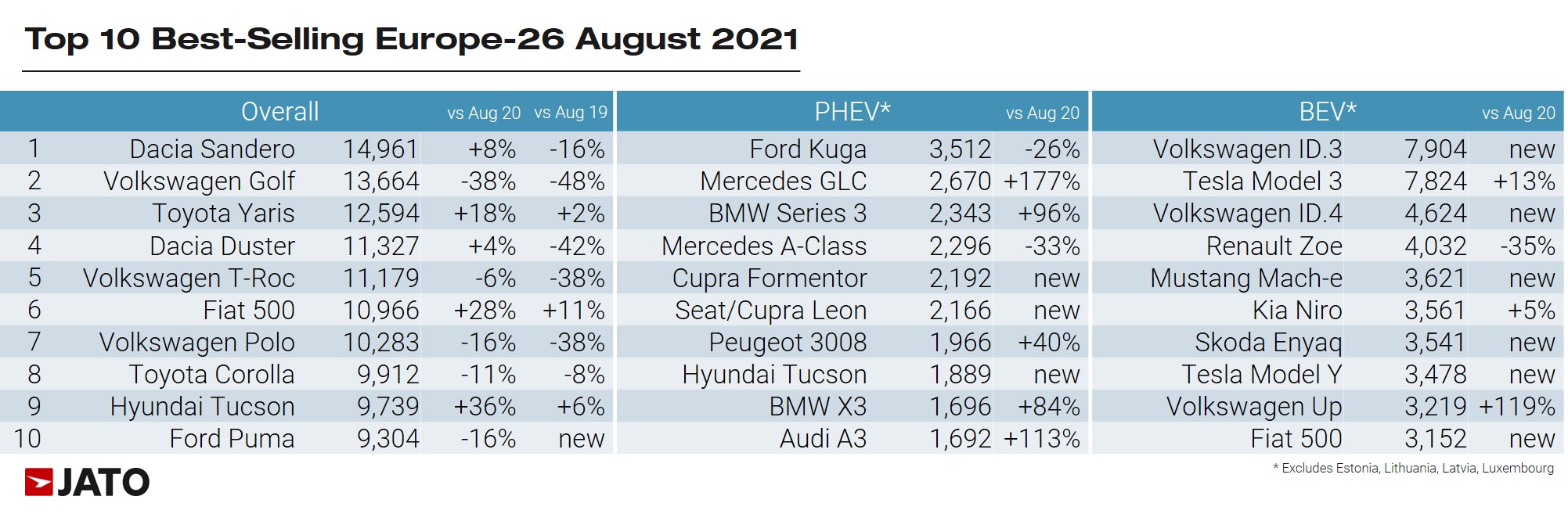 In August, EVs and plug-in hybrids outsold their diesel counterparts. This time last year, the volume of EVs was 158,300 units less than diesel car registrations, however last month we saw these EVs outsell diesel vehicles by 10,100 units. Demand was particularly strong for the electric versions of the Fiat 500, Peugeot 208, Hyundai Kona, Opel Corsa and Kia Niro, in addition to the outstanding results of the Volkswagen ID.3 – Europe’s top-selling EV during the month.