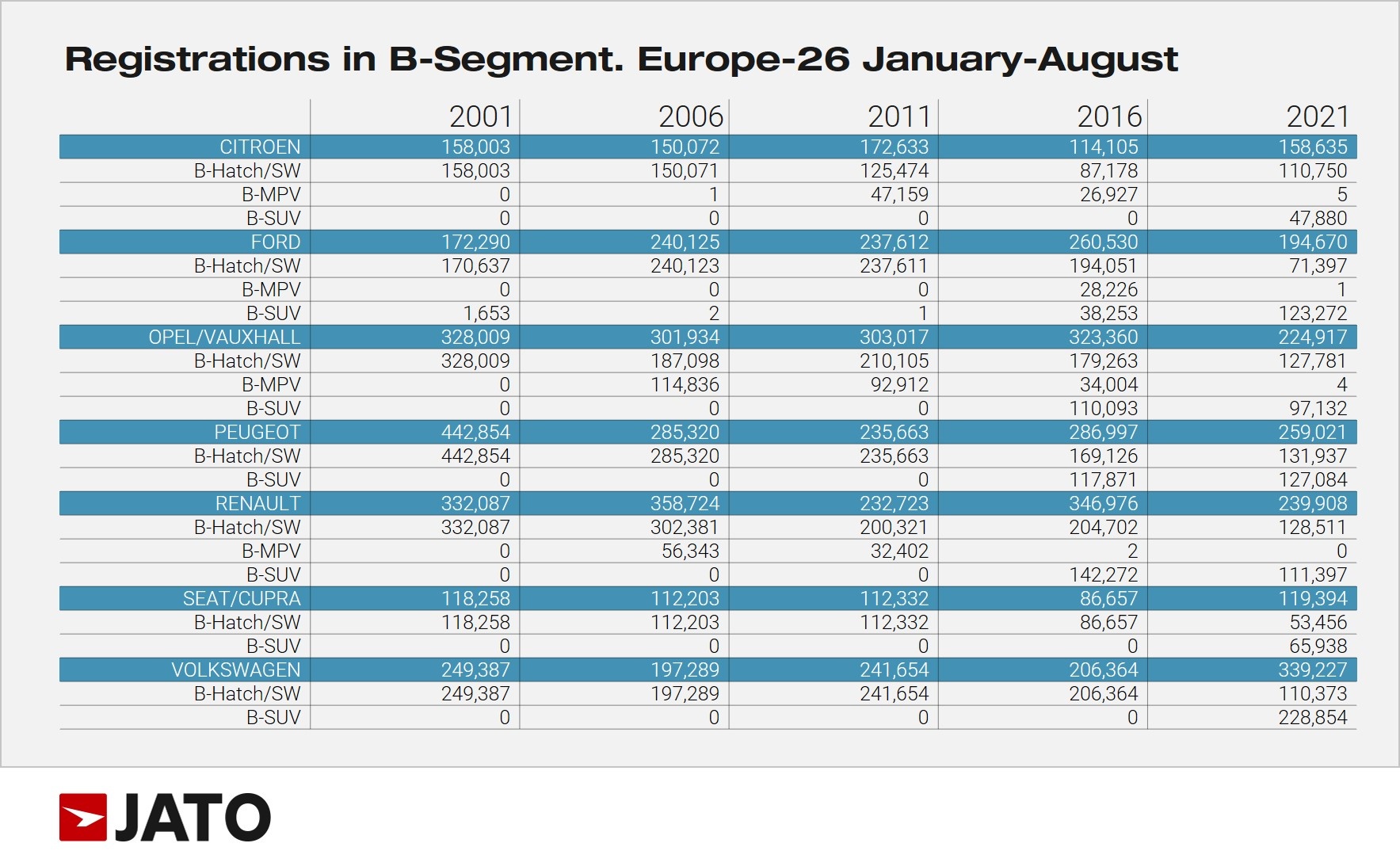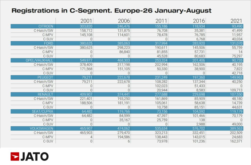 According to JATO’s data for Europe, the seven European car brands that focused their efforts on developing SUVs, have seen their overall sales in the B and C segments fall dramatically between 2001 and 2021.