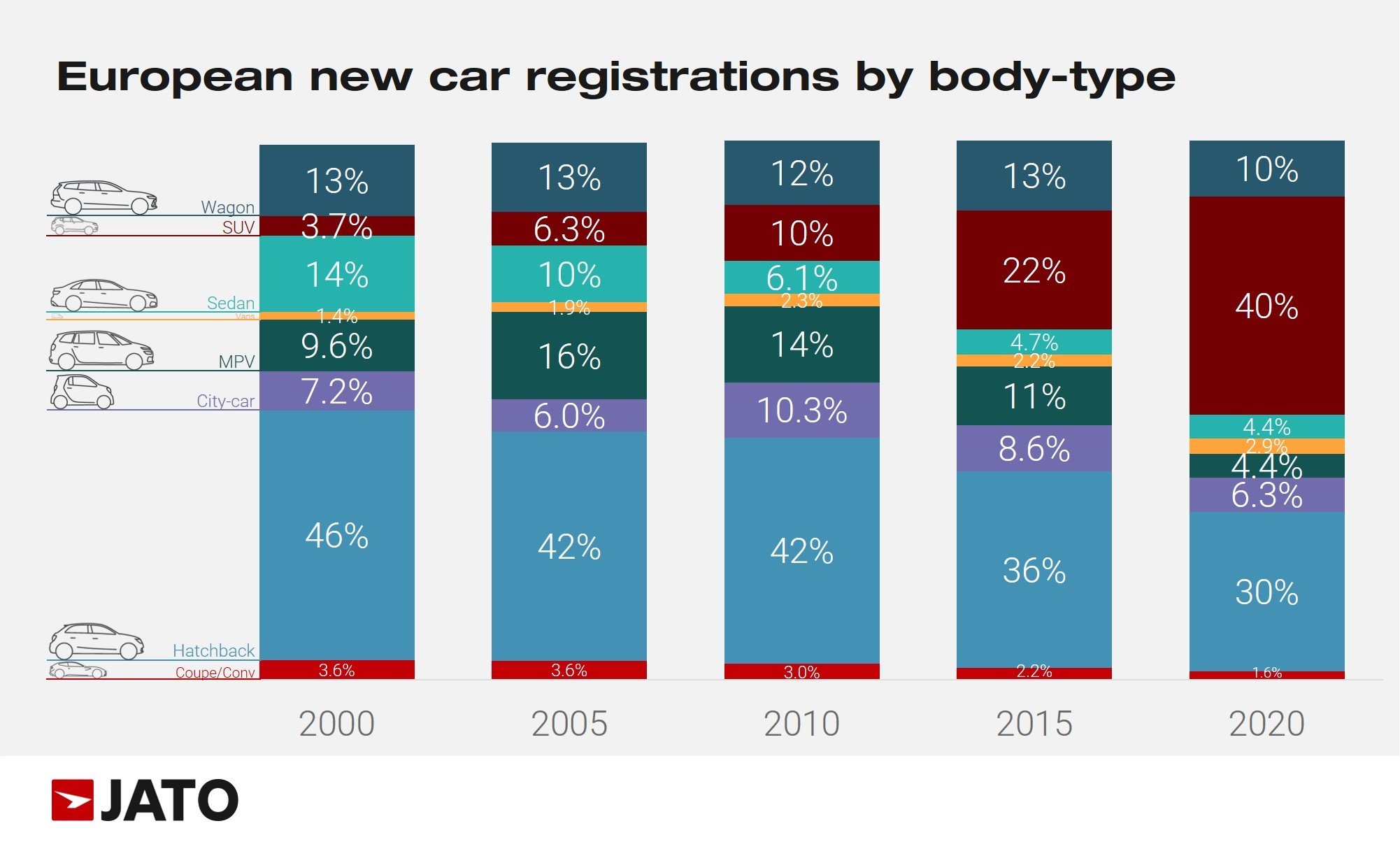 If anything is clear, it’s that the rising popularity of SUVs has come at the expense of traditional segments. OEMs have worked hard to develop a wide range of SUVs, and this has directly affected the preferences of consumers, with many now considering these vehicles to be safer and generally more appealing. And while SUVs have helped OEM profit margins, this has had little impact on total registrations volumes which continue to plateau.