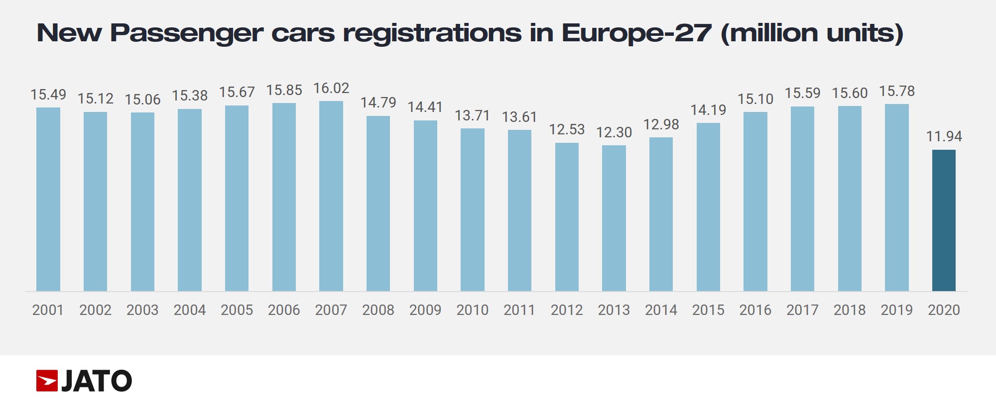 The European new car market closed 2020 with further decline. According to data for 27 markets, the volume fell by 3.8% in December 2020 to 1,212,858 units. While this demonstrates a smaller decrease than seen in previous months, this did not offset the overall trend as cumulative registrations for the full year totalled 11,941,633 units, down by 24%.