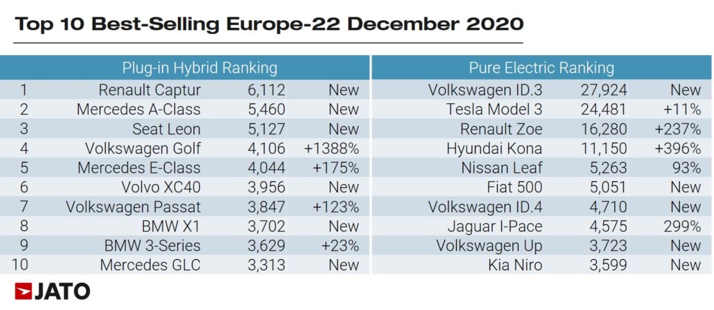 The strong demand for EVs resulted in two electric models securing places in the top 3 European best-selling cars. Behind the popular Volkswagen Golf, the Volkswagen ID.3 registered almost 28,000 units and became the second most registered car in Europe, during December. This significant achievement was possible due to positive results posted in the Netherlands, Sweden and Austria – where it led the overall rankings. The ID.3 was Germany’s third best-selling car, the 4th best-selling in the UK, and the 2nd best-seller in Denmark, Norway and Luxembourg. Click here to see the ranking for the full year.