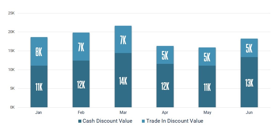 In India, average discounts by classification were largely led by Cash and Trade-In as the most accepted incentives type in the market. For cash discounts, the average discount offered was 14K with the highest recorded in March. The trade-in discount offered in January was as high as 8K but subsequently dropped to 3K by June.