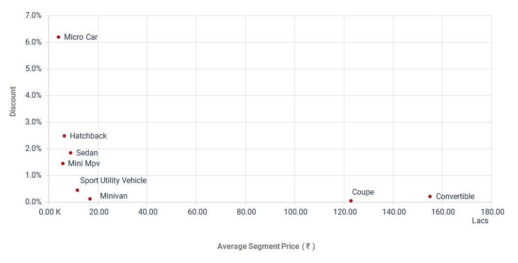 Micro Cars offer the highest discount across all segments with 6.2% of the average segment price; however, in the Indian market the most bodytype with the largest market share was the hatchback which offered an average discount of 2.5% . On the other hand, the growing SUV segment offered an average discount of only 0.5%, and stands in second position for volume. With high prices and loaded features in sedans, the average discount offered is 1.9%, standing in the third position for volume.