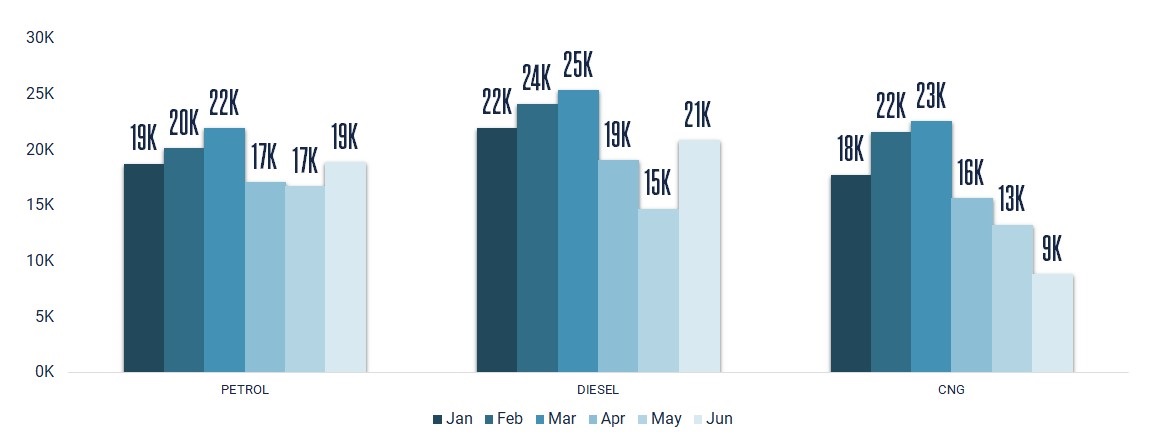 After March 2021, incentives decreased across all fuel types until June where we saw an increase for petrol by 3K, and 4K for diesel. In the case of CNG however we saw incentives continue to decrease by 14K in June.