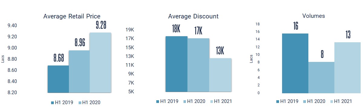 Average retail price in H1 2021 increased by 32K compared to H1 2020, standing at 928K – the highest figure over the last two years – whereas the average discount stood at 13k in H1 2021 after a drop of 4K compared to H1 2020, and 5K in H1 2019.